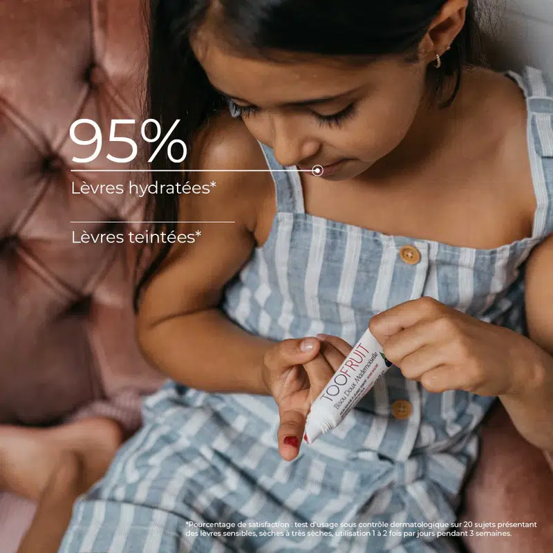 Comme notre baume Bisou Doux classique, notre soin des lèvres teinté est vendu sous la forme d’un tube applicateur de 10 mL à la fois pratique, nomade et hygiénique. Pour s’en servir, rien de plus simple : on appuie légèrement sur le tube et on applique directement le baume sur les lèvres en le répartissant avec l’embout applicateur. Trousse de toilette, cartable, poche de manteau : notre baume à lèvres se glisse partout pour une utilisation tout au long de la journée.