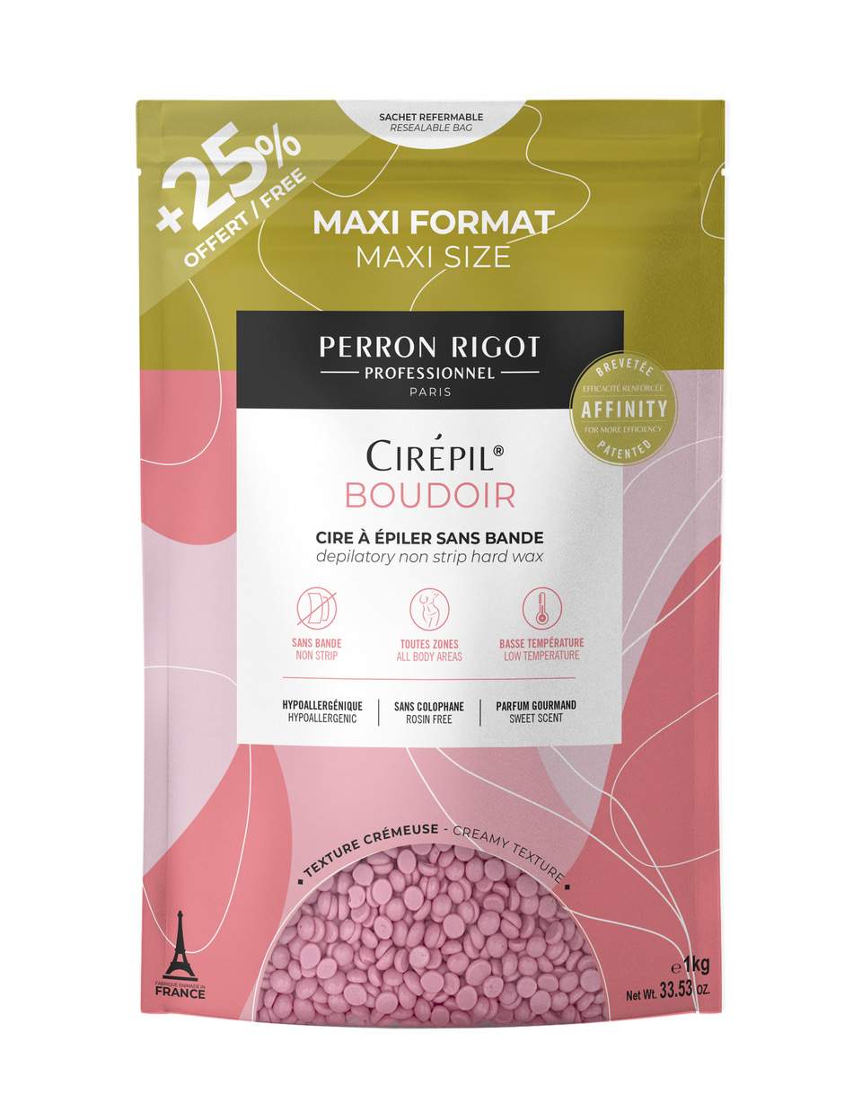 Cire sensorielle et gourmande   Proposez à vos clientes les plus sensibles, cette cire rose nacrée, au parfum gourmand remplie de tendresse, pour une épilation tout en douceur. Sa texture crémeuse et sa température d’utilisation confortable permettent une application agréable et enveloppante. Sa formule hypoallergénique et sans colophane est donc parfaitement adaptée aux premières épilations.  De quoi convaincre dès le plus jeune âge de démarrer leurs épilations chez vous !   – Texture crémeuse  – Parfum gourmand – Toutes les zones – Formule basse température : réglage du chauffe-cire digital entre 66° et 70°  – Hypoallergénique – Brevet affinity – Couleur rose nacré   Pensée et fabriquée en France. Sachet de 800 g.   Liste INCI : HYDROGENATED POLYDICYCLOPENTADIENE, PARAFFIN, ETHYLENE/OCTENE COPOLYMER, CERA ALBA (BEESWAX), CI 77891 (TITANIUM DIOXIDE), PARFUM (FRAGRANCE), CI 77019 (MICA), CI 77861 (TIN OXIDE), SYNTHETIC WAX, CI 15850 (D&C RED 6 LAKE).