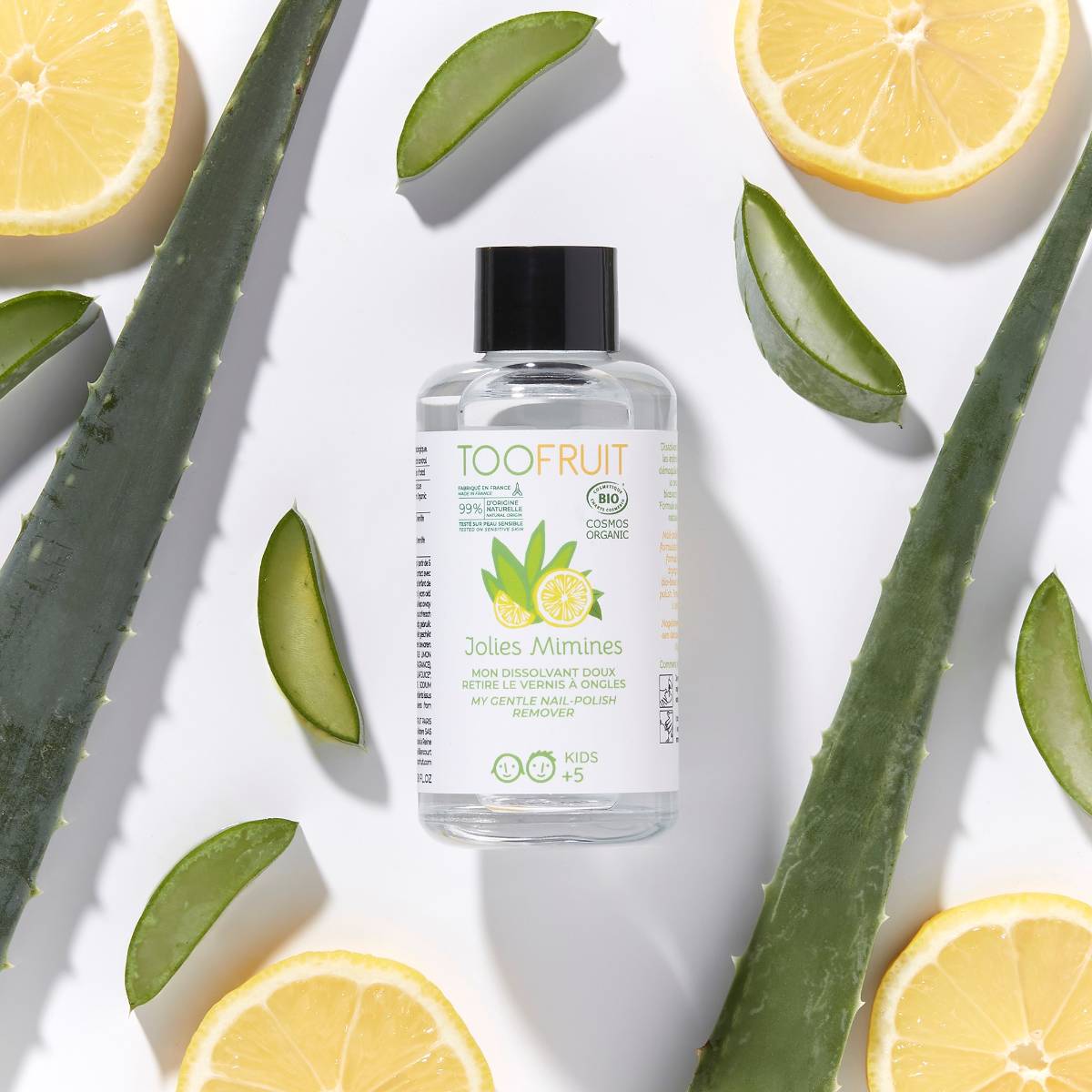 Mon Dissolvant Jolies Mimines TOOFRUIT certifié bio est spécifiquement conçu pour les mains et ongles délicat des enfants.