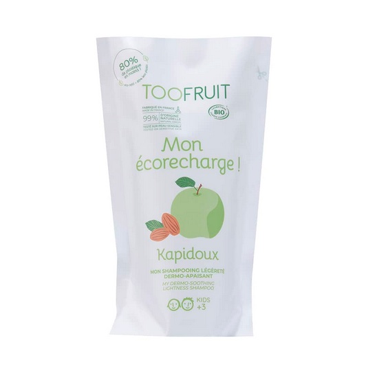 Le Shampoing Dermo-apaisant Kapidoux bio Pomme-Amande TOOFRUIT nettoie parfaitement le cheveu des enfants tout en respectant leur cuir chevelu sensible.